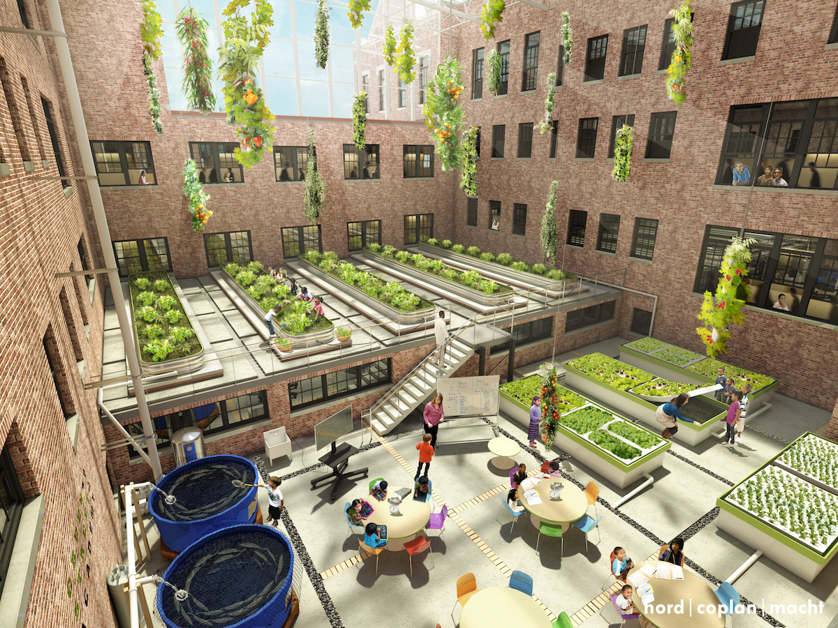 I wasn’t sure what to make of that comment at first, but as I saw more of the building, I understood what Jon meant. Structurally, Gwynn Falls is in great condition, and many of its interior parts, including a “ridiculously efficient” heating and cooling system, either still function properly or don’t need much tinkering (relative to a project of this scale). Jon showed me planned areas for classrooms, computer labs, libraries, internal courtyards that are slated to become greenhouses, and a large space where the school’s tilapia tanks will be outfitted with a filtration system to create a closed-loop living machine, all without significantly altering the building’s existing infrastructure.