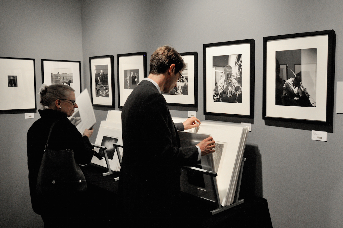 AIPAD visitors browse through the offering of Michael Dawson Gallery from Los Angeles. Seen here are rare photographs from a series “Nights in Birdland” by Carol Reiff, one of the few female jazz photographers working in New York in the 1950s. As a freelance photojournalist, she covered recording sessions, interviews, jam sessions, events and concerts. Right to left are photographs of Paul Chambers and Miles Davis.