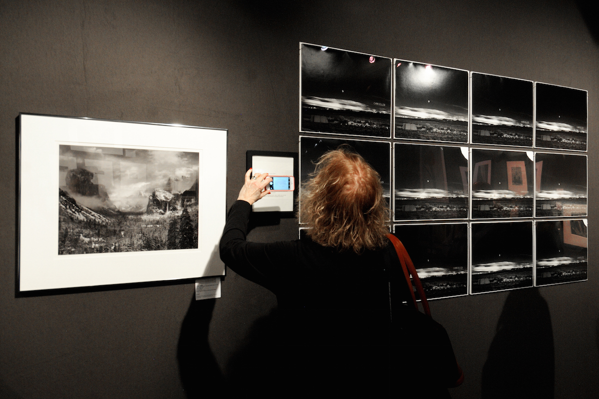 A woman using her smartphone’s camera to capture an AIPAD exhibit reminds us how far photography technology has come over the two centuries of its documented history. Seen here is Scott Nichols Gallery’s installation of works by prominent landscape photographer Ansel Adams. On the left is his 1944 photograph of Yosemite National Park titled “Clearing Winter Storm”. On the right is a series of 12 darkroom artifacts of his famous image “Moonrise, Hernandez” that the artist intentionally destroyed with a Wells Fargo check-cancelling machine after realizing they were printed on a defective batch of Ilfordbrom paper. The “Cancelled Moonrise Artifacts” series has questionable value but offers us a rare glimpse into Ansel Adams’ creative process by illustrating the inconsistencies and difficulties of the photographic process.